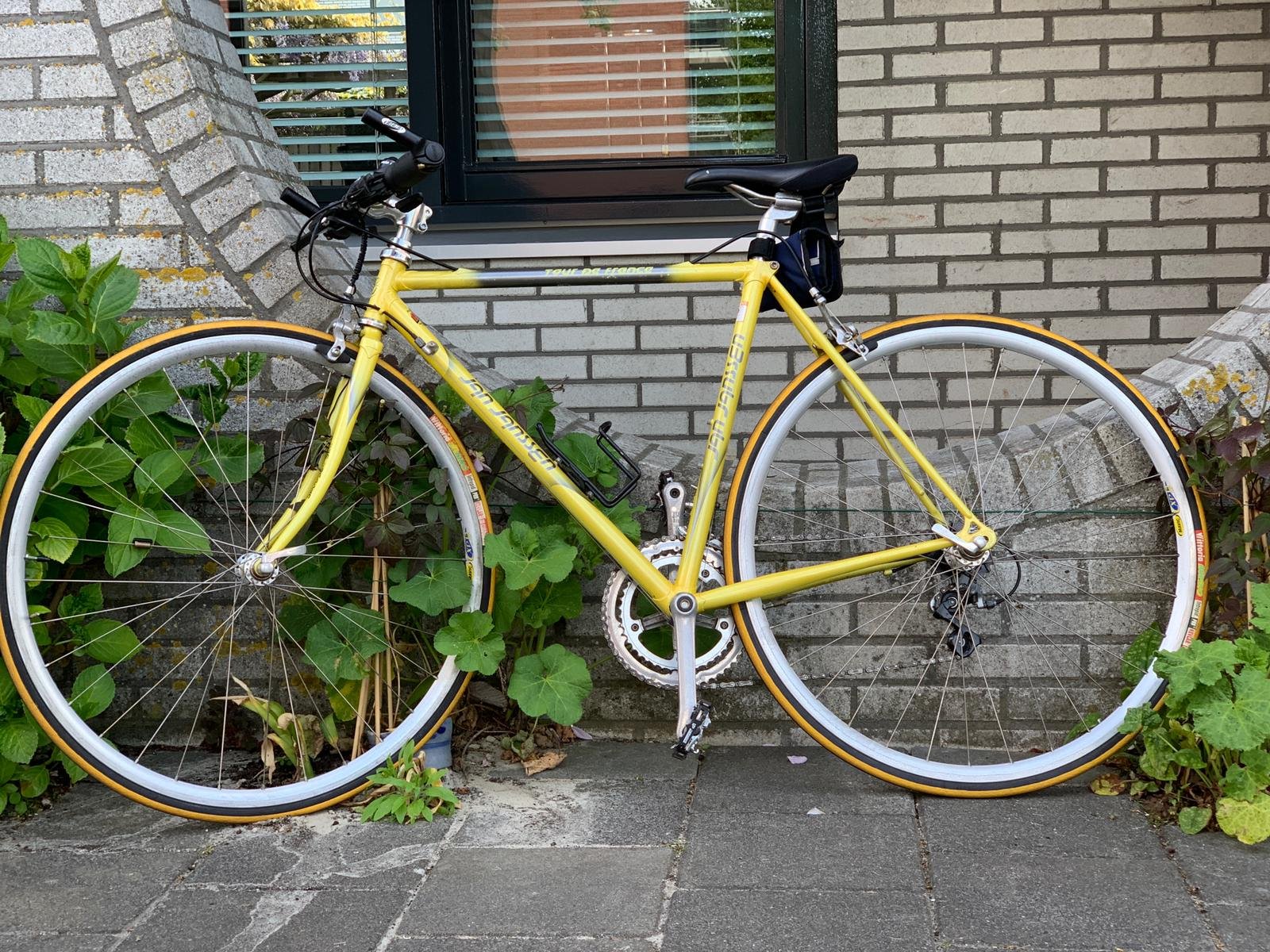 Gele retro Jan Janssen Tour de France racefiets uit 1989 incl. nieuwe fietscomputer