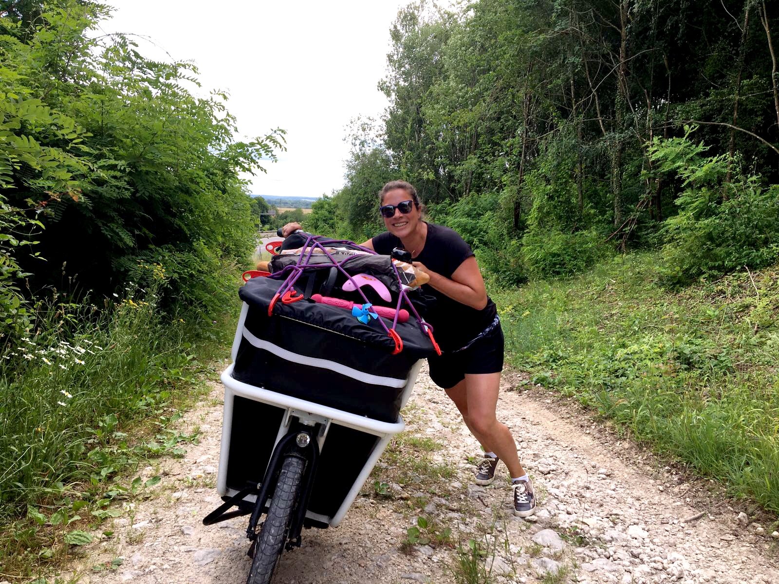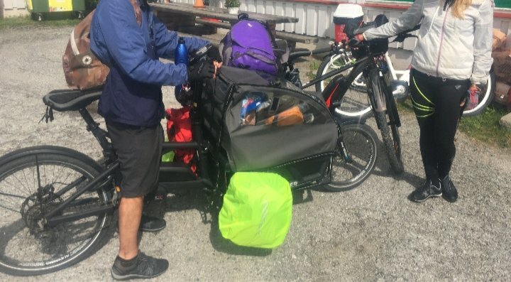 Op het voorwiel zit er trouwens wel veel gewicht. De bak zit dichter bij het voorwiel dan bij het achterwiel. In de achterste tassen zitten vooral lichte spullen zoals slaapzakken. Met een kind, een zware vijfpersoonstent, opvouwbaar tafeltje en stoeltjes, kledij voor een week, eten en gasfornuisje,... is het enige alternatief een auto, maar dat vind ik helemaal niet zo leuk en uitdagend (en we hebben geen auto ;) )