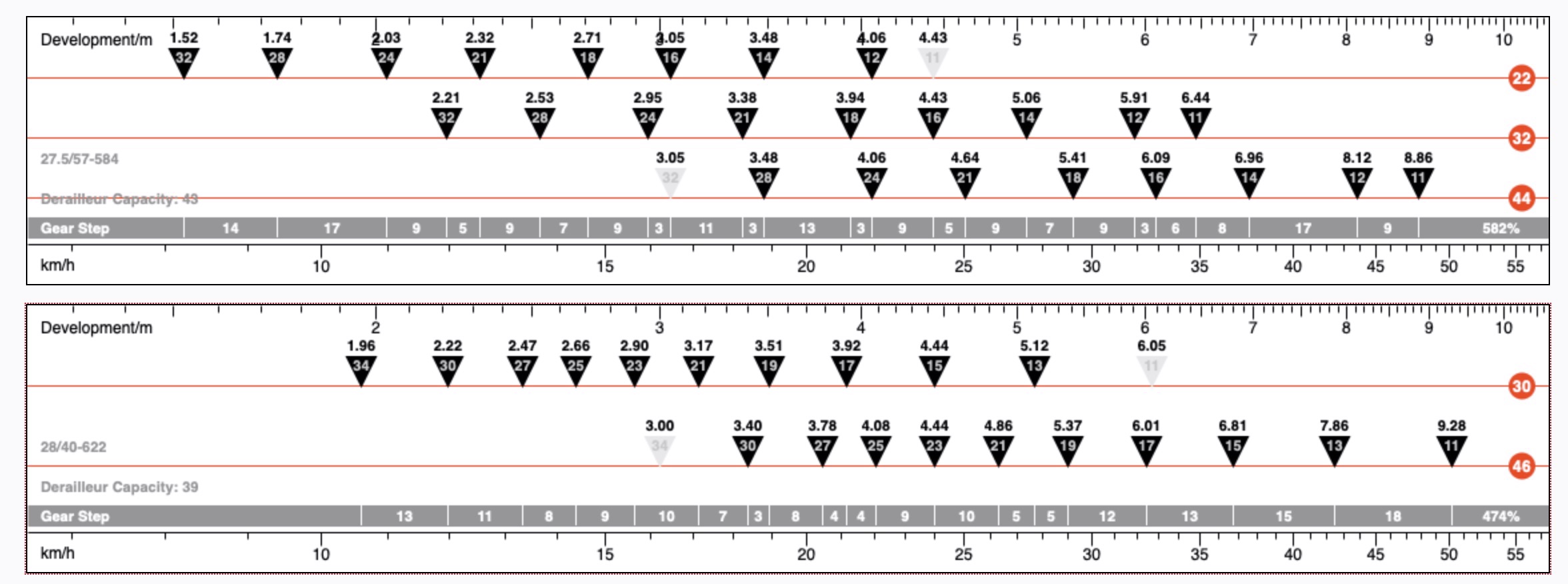 U vraagt, wij draaien: 46-30T met 11-34T cassette (2x11) versus 44-32-22T met 11-32T cassette (3x9)