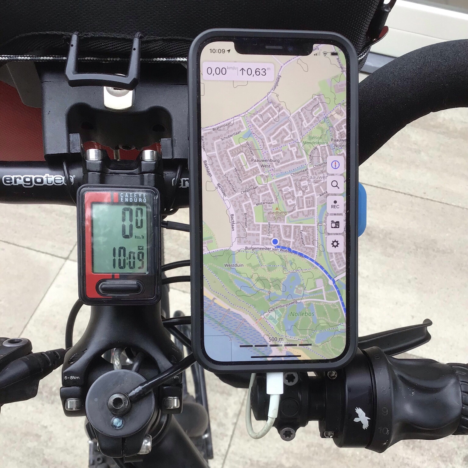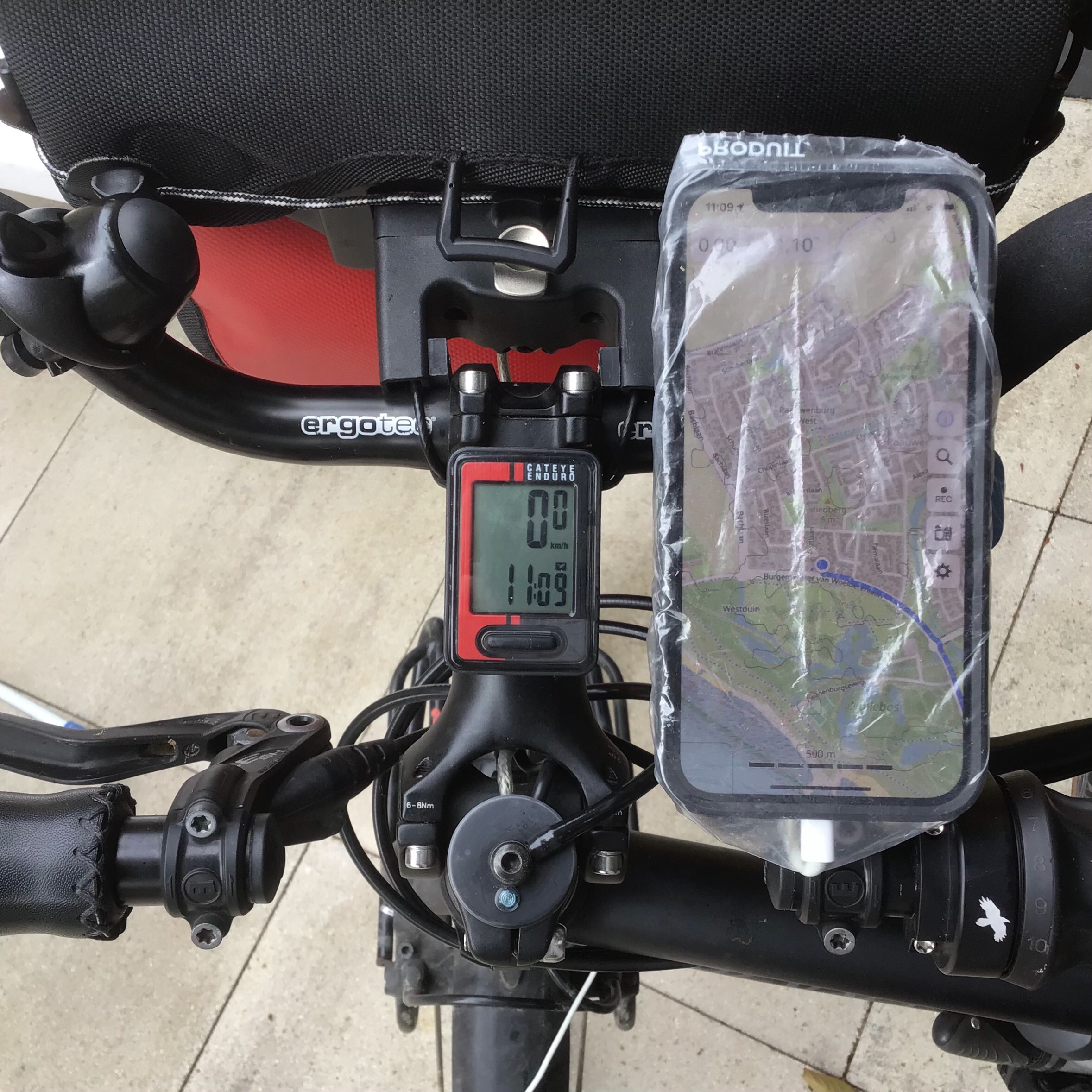 De derde fietsdag een plastic zakje met postbode-elastiek over de iPhone gedaan. Dit werkte uitstekend en de leesbaarheid was ruim voldoende. Alleen FaceID werkte niet, dus de code intoetsen om het scherm te unlocken. Verder geen problemen met het touchscreen en regen gehad.