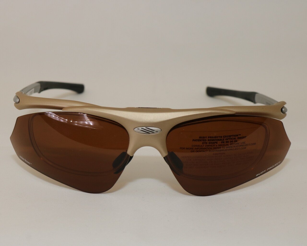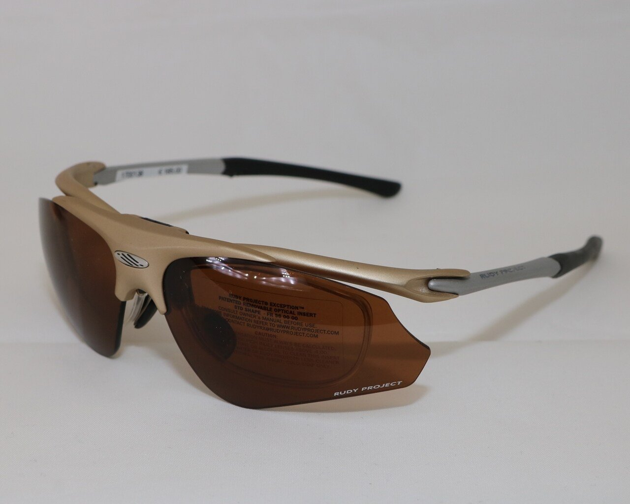 Rudy Project model "Exception STD". Titaankleurig montuur (138mm) met "Action Brown" glazen. Met foudraal.