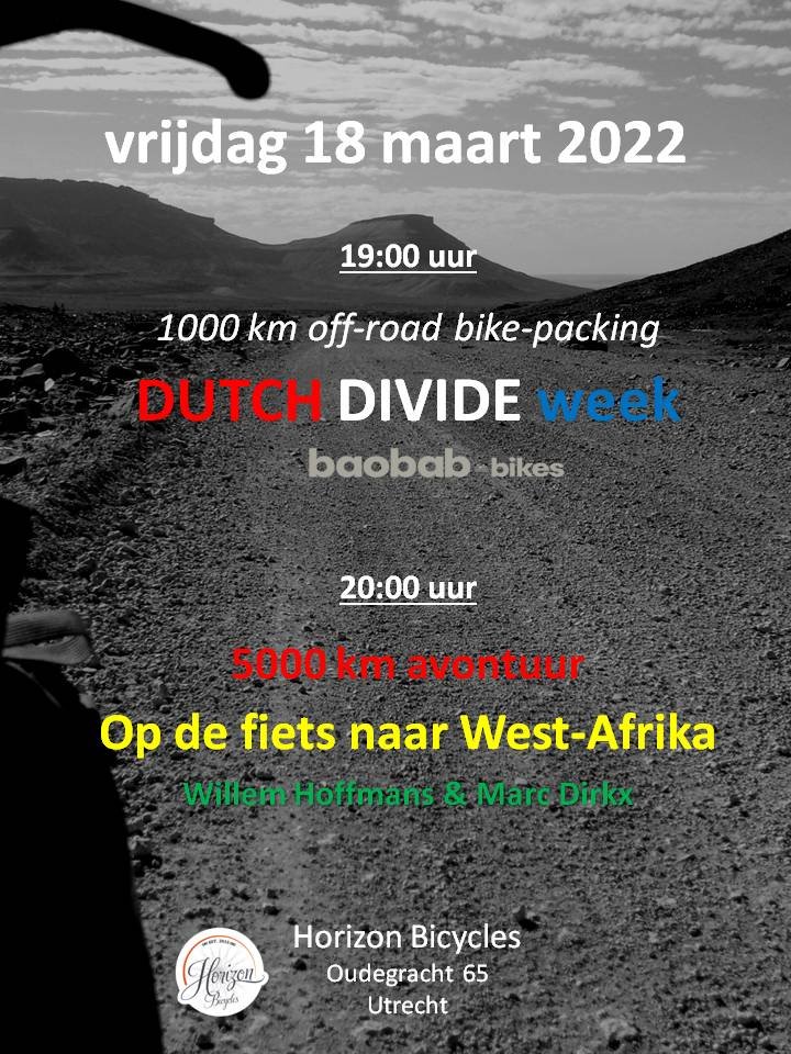 - 19:00 uur Presentatie programma Dutch Divide Week door Baobab Bikes. Meer informatie over de Dutch Divide en de Dutch Divide Week vind je op http://baobab-bikes.nl