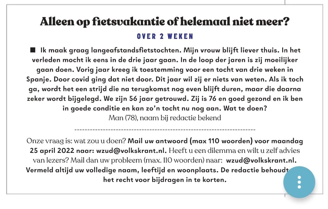 Vandaag in De Volkskrant: Alleen op fietsvakantie...?