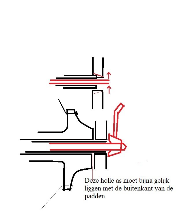 De buis van de uitvalnaaf steekt links en rechts even ver in de padden.