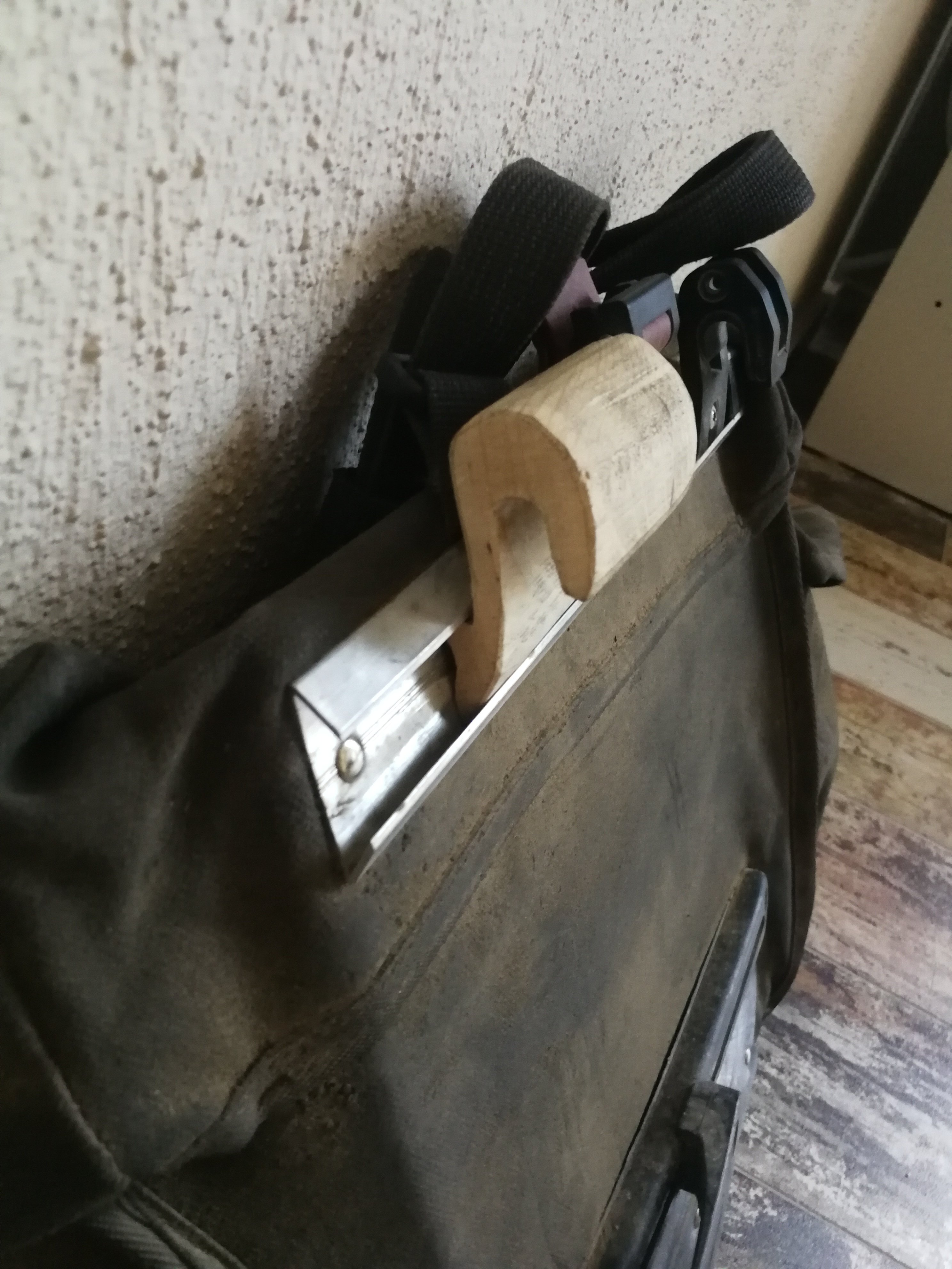 Ik schrok ook toen ik deze noodreparatie zag. Had met de hersteller afgesproken dat hij metaal tot een haak zou buigen en gewoon aan de tas bouten. Maar blijkbaar is hij van idee veranderd. De man (in Thessaloniki) bouwt al eens een Cargobike en zag er best handig en betrouwbaar uit, maar ik weet niet wat ik er van moet vinden: "belachelijk" of "kan even mee".