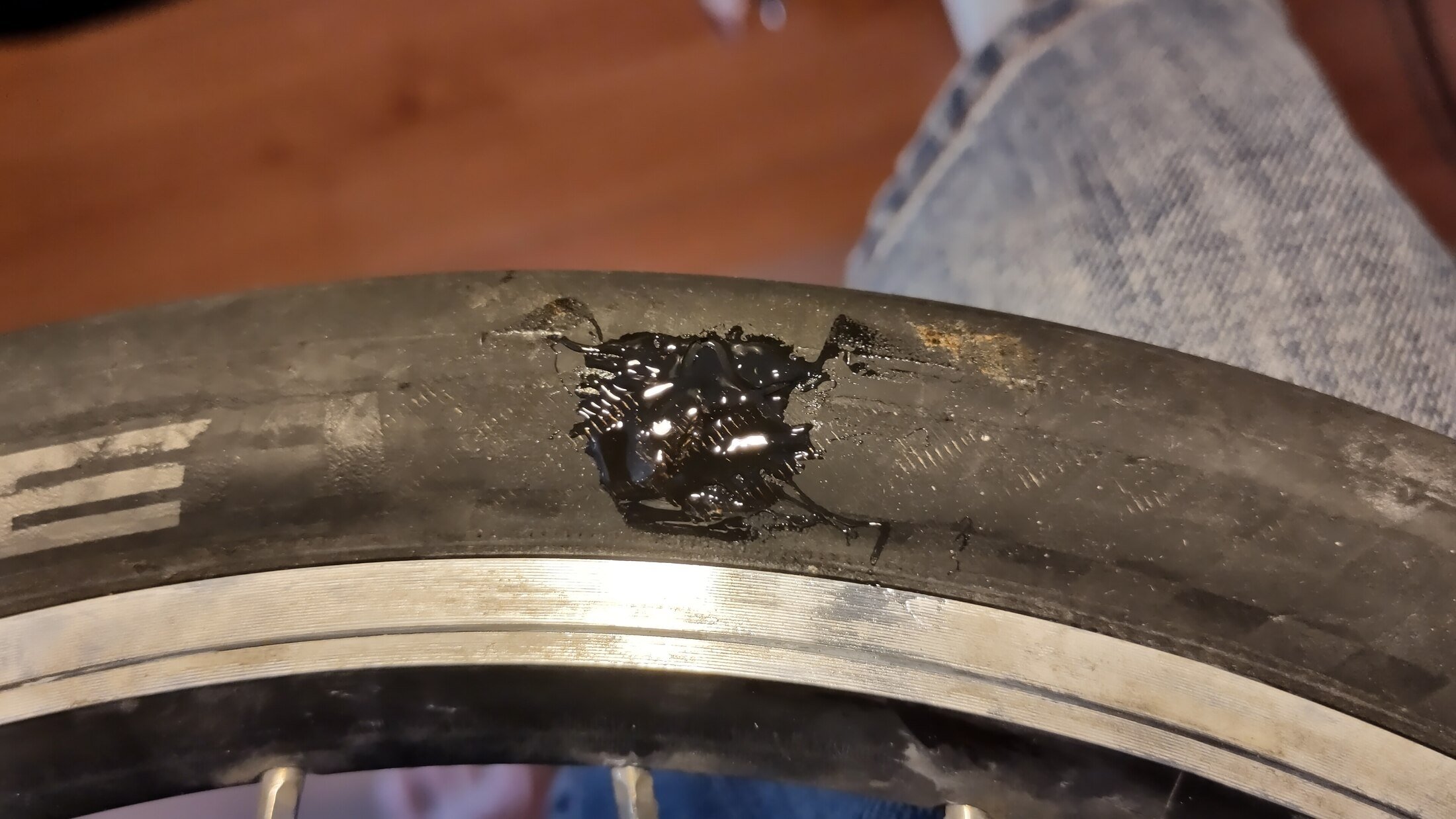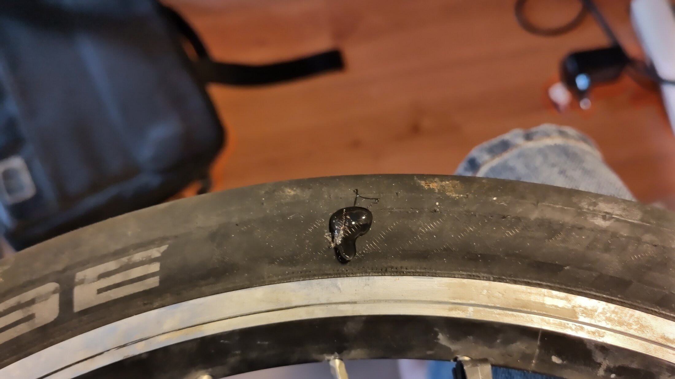 Tijdens een fietstocht (althans tijdens een pauze) merkte ik een afwijking op de voorband: één (of enkele) van de vezels heeft zich door de buitenwand naar buiten gewerkt. Had ik zelf nog niet eerder gezien. Aan de binnenkant is niets zichtbaar en ook geen afwijkend "gevoel" bij het kneden van de band. Geen idee hoe lang ik al hier mee rijd.