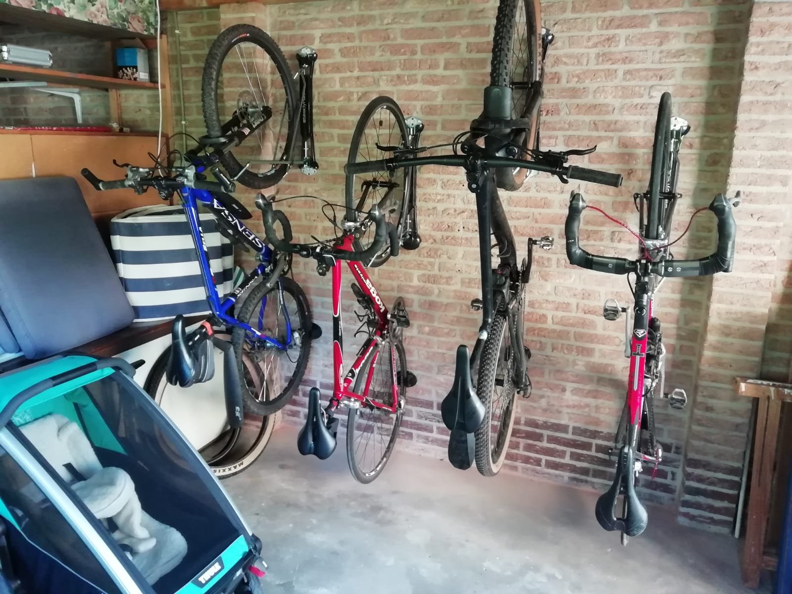 Er hangen hier een aantal fietsen verticaal in de garage. Voorwiel omhoog. De haken zijn van het merk Mottez en zijn gekocht bij de Praxis. Per stuk wel 5,- euro. Het hangt al zeker tien jaar zonder problemen.