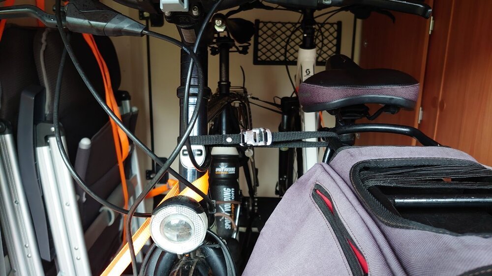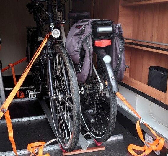 Let op de spanbanden voor en achteraan de fietsen en het bandje tussen de fietsen.