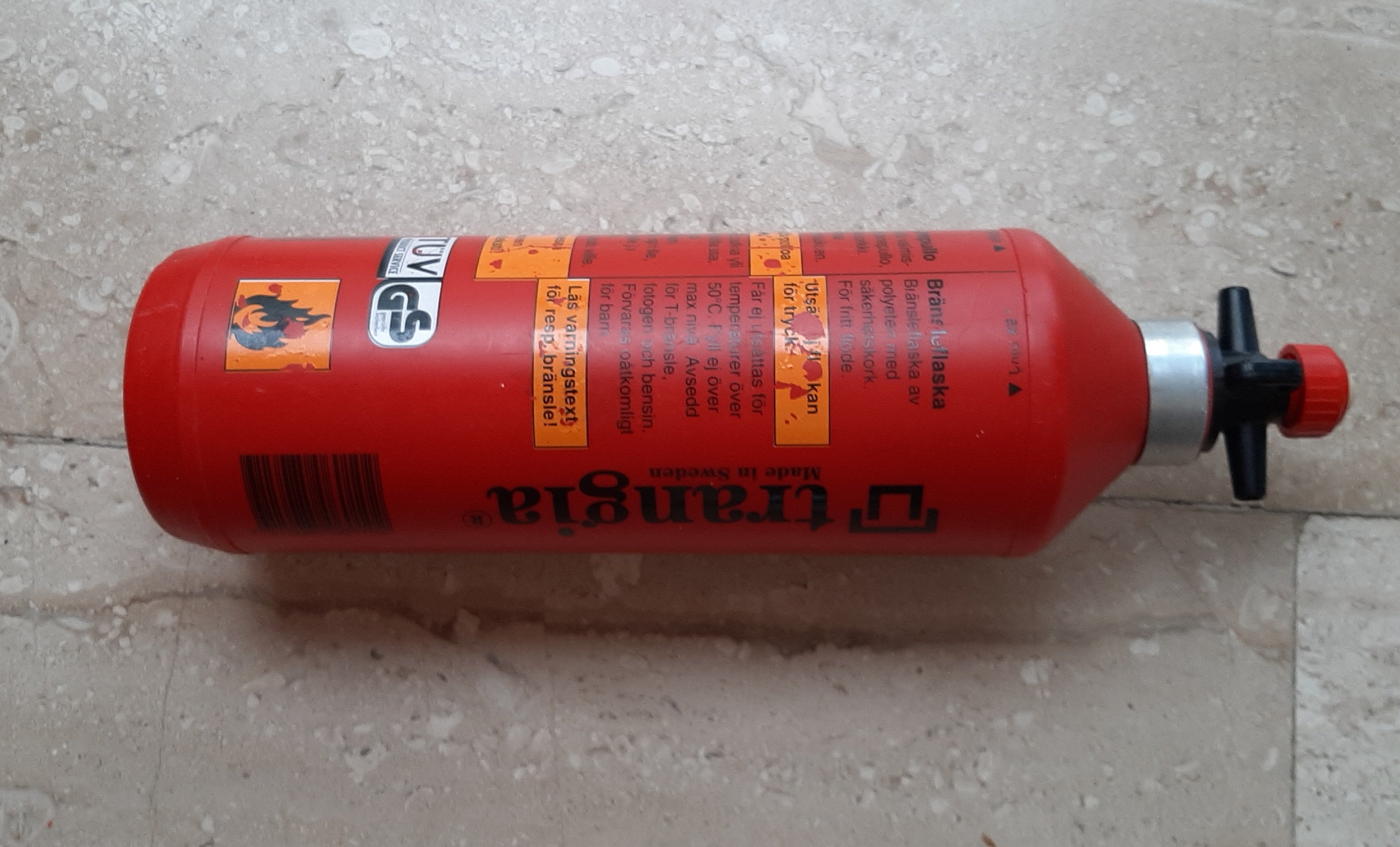 Deze is niet bedoeld voor op pompjes, maar is een heel veilige schenkfles. Volgens mij voor spiritus, methanol, bio-ethanol e.d., niet voor benzine.