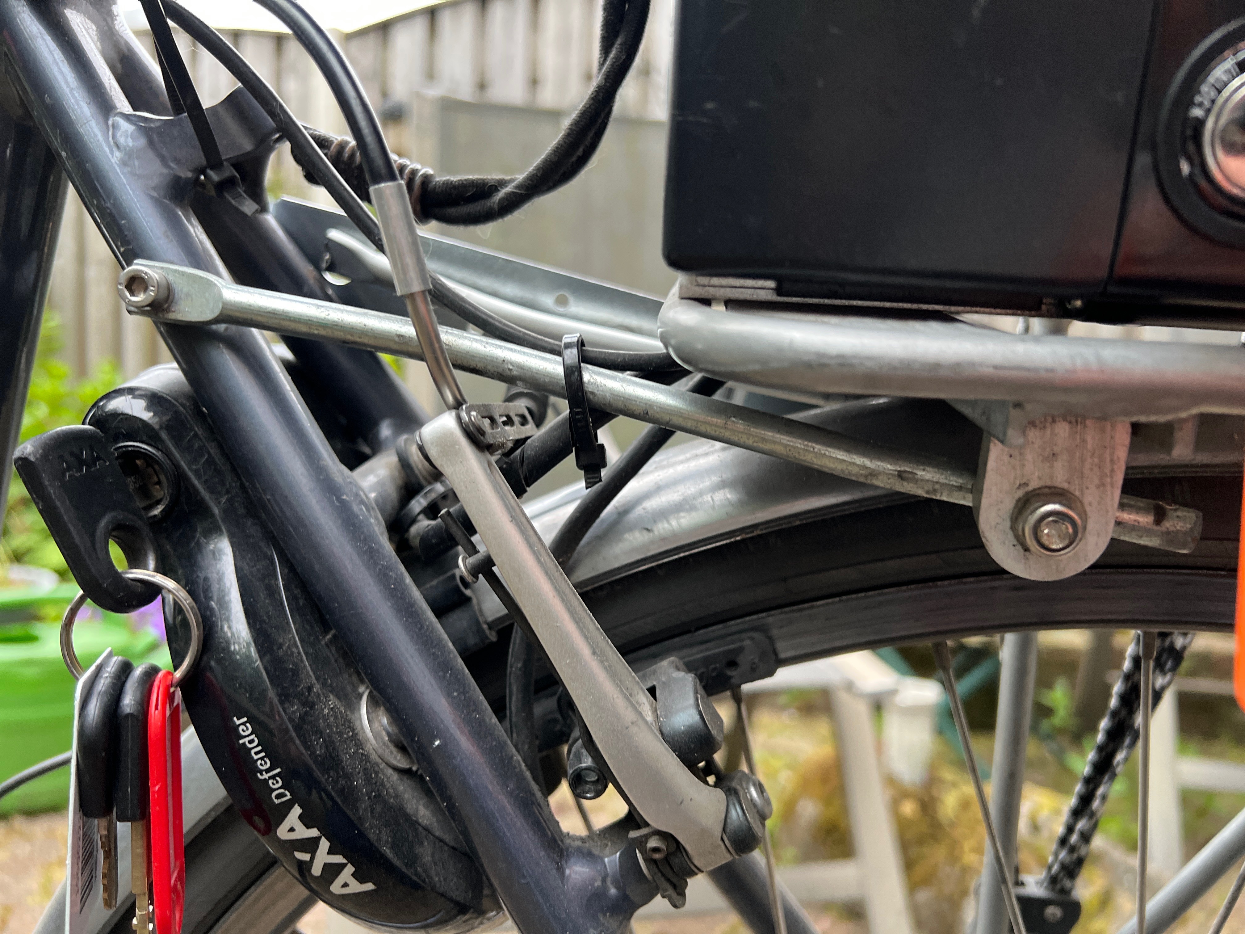Inmiddels een oplossing gevonden. Links achter zit het rek aan mijn frame vast met een stalen pen. Rechts is de kapotte aluminiumversie vervangen door een stuk plaatstaal. Mijn fietsenmaker en een technische iemand geven groen licht. Mijn velgen en spaken volstaan. Om een chemische reactie tussen metaal en aluminium de voorkomen gebruik ik kunststof ringen en zet ik de boel vast met borg moeren. Ook neem ik reserve materiaal mee