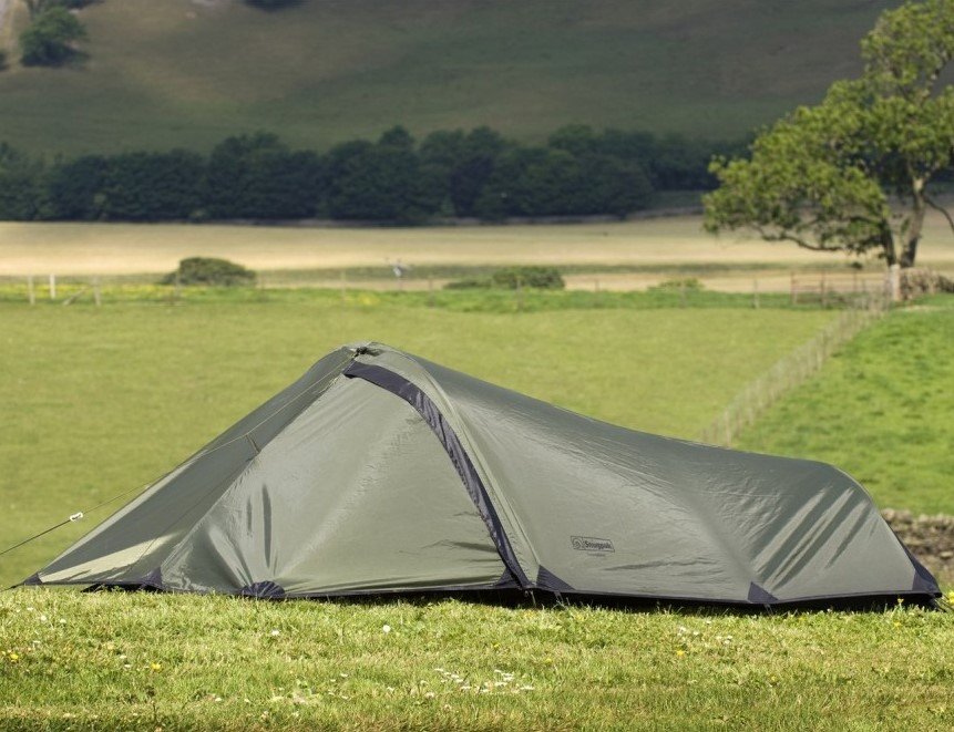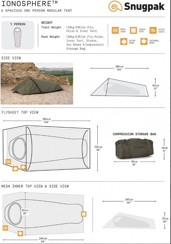 Compacte 1 persoons tent. Gewicht 1520 gram. Afmeting: 265cm(L)x100cm(B). Ingepakt: 48cmx14cm