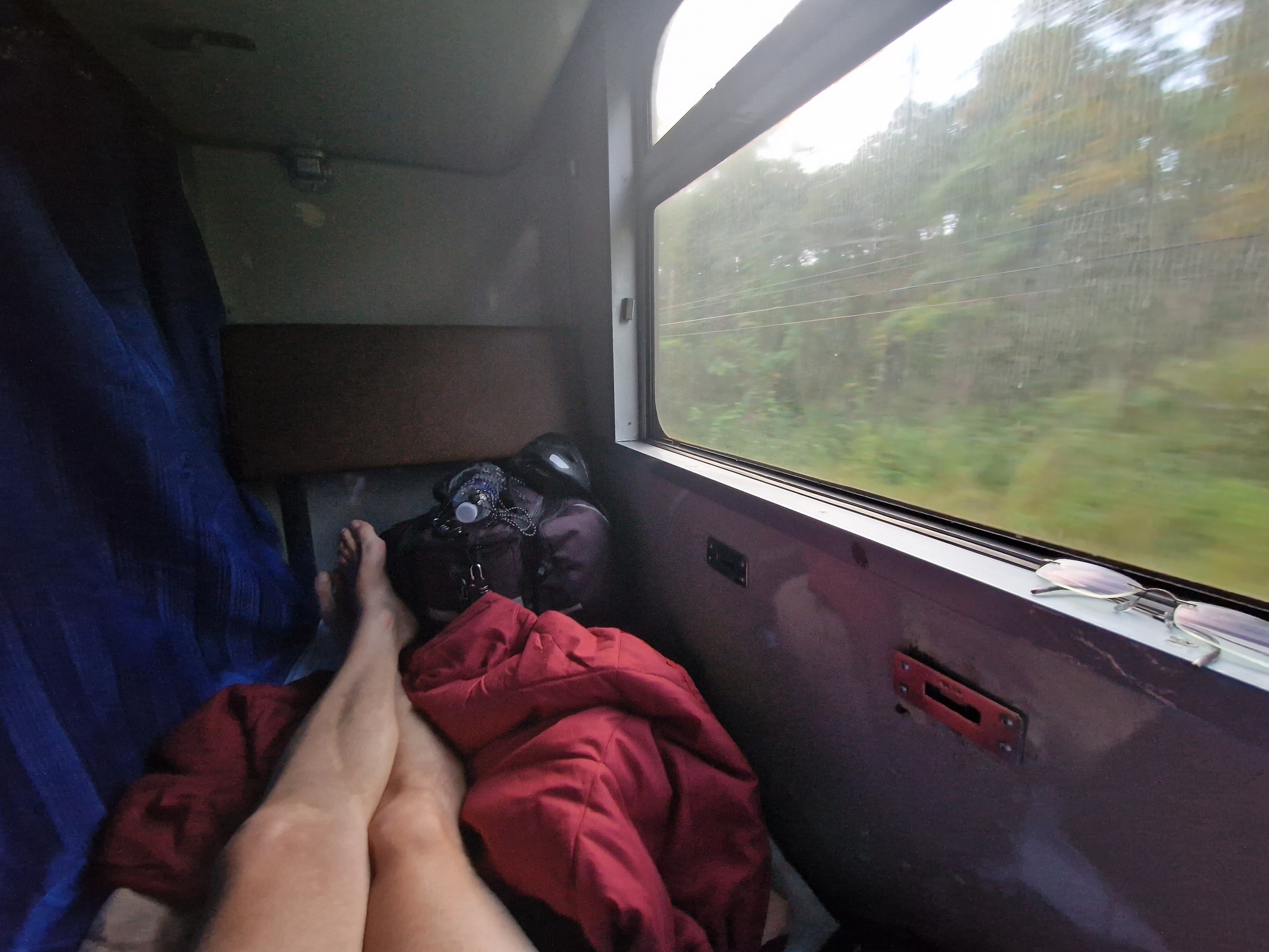 De fiets wordt probleemloos in de vrachtwagon gezet en ik zoek mijn coupé in de trein. Ik reserveerde een laag bedje, want de hoogslapers liggen nogal dicht bij het airco-systeem, had ik op het internet gelezen. Boven me ligt een jonge Nederlander die voor de eerste keer Thailand zal verkennen. Na een leuk kort gesprek kruip ik in mijn bedje en trek de gordijntjes dicht zodat ik een knus minikamertje heb. De matras lijkt perfect en plaats is er ook genoeg – ik kan mijn fietszakken zelfs mee in bed nemen. Dit wordt een leuke nachtrust. Of toch niet – enkele luidruchtige Italianen beslissen er anders over. Ook het treingeluid wiegt me niet in slaap – daarvoor is het echt veel te luid. Het wordt dus gewoon wat rusten en enkele uren later met een slaperige kop genieten van het ochtendgloren en de opkomende zon over de Noord-Thaise jungle en rijstvelden.