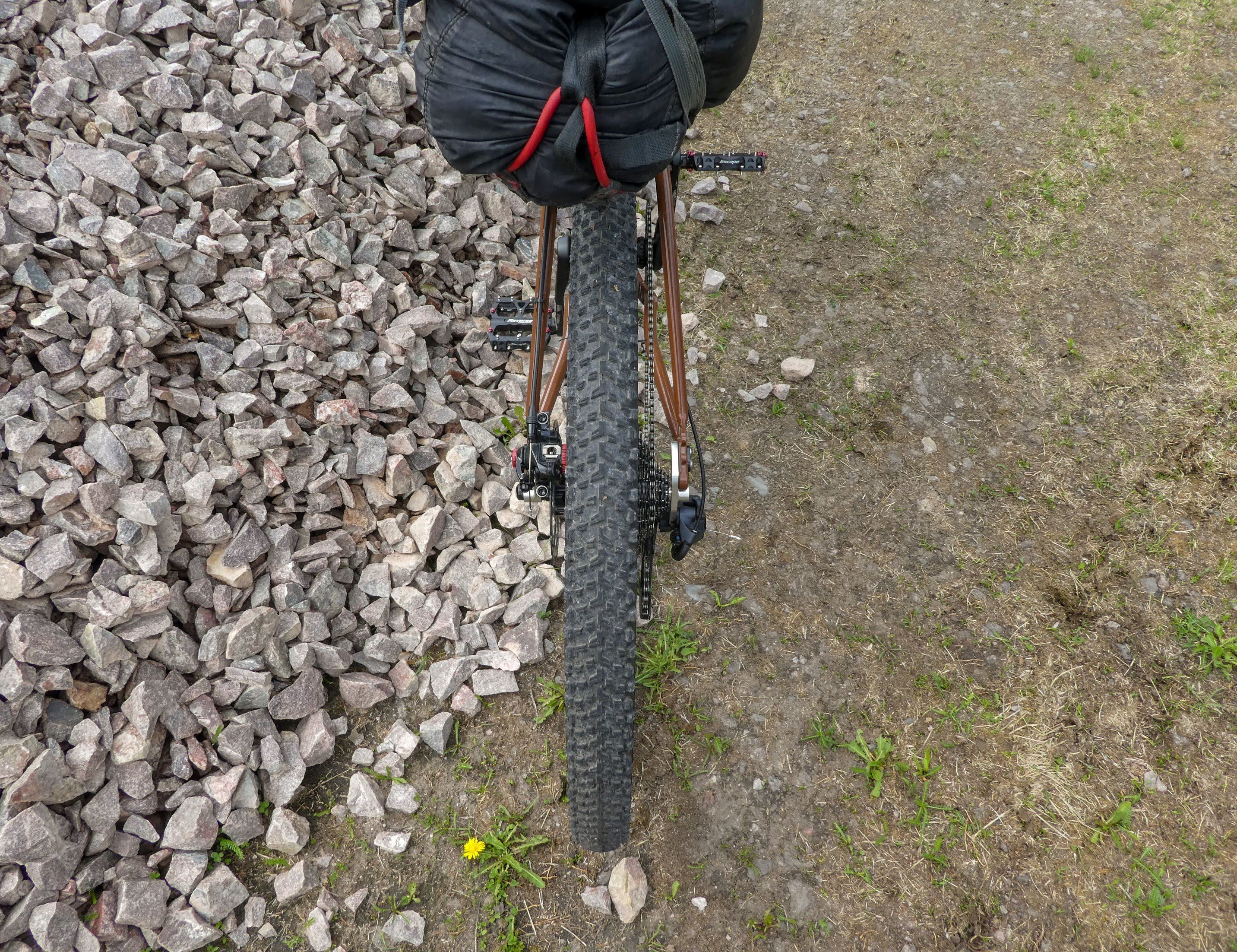 Zweedse gravel is ook vaak niet hetzelfde als nederlandse, vooral niet de verse gravel die net is gestort. Weet de nederlandse naam niet maar hier heet dat bergkros of makadam, en het zijn scherpe grove stenen. Je stuitert alle kanten op, en al snel voel je je polsen, armen, schouders etc. Niet te doen met dunne bandjes en tig kilo bagage.