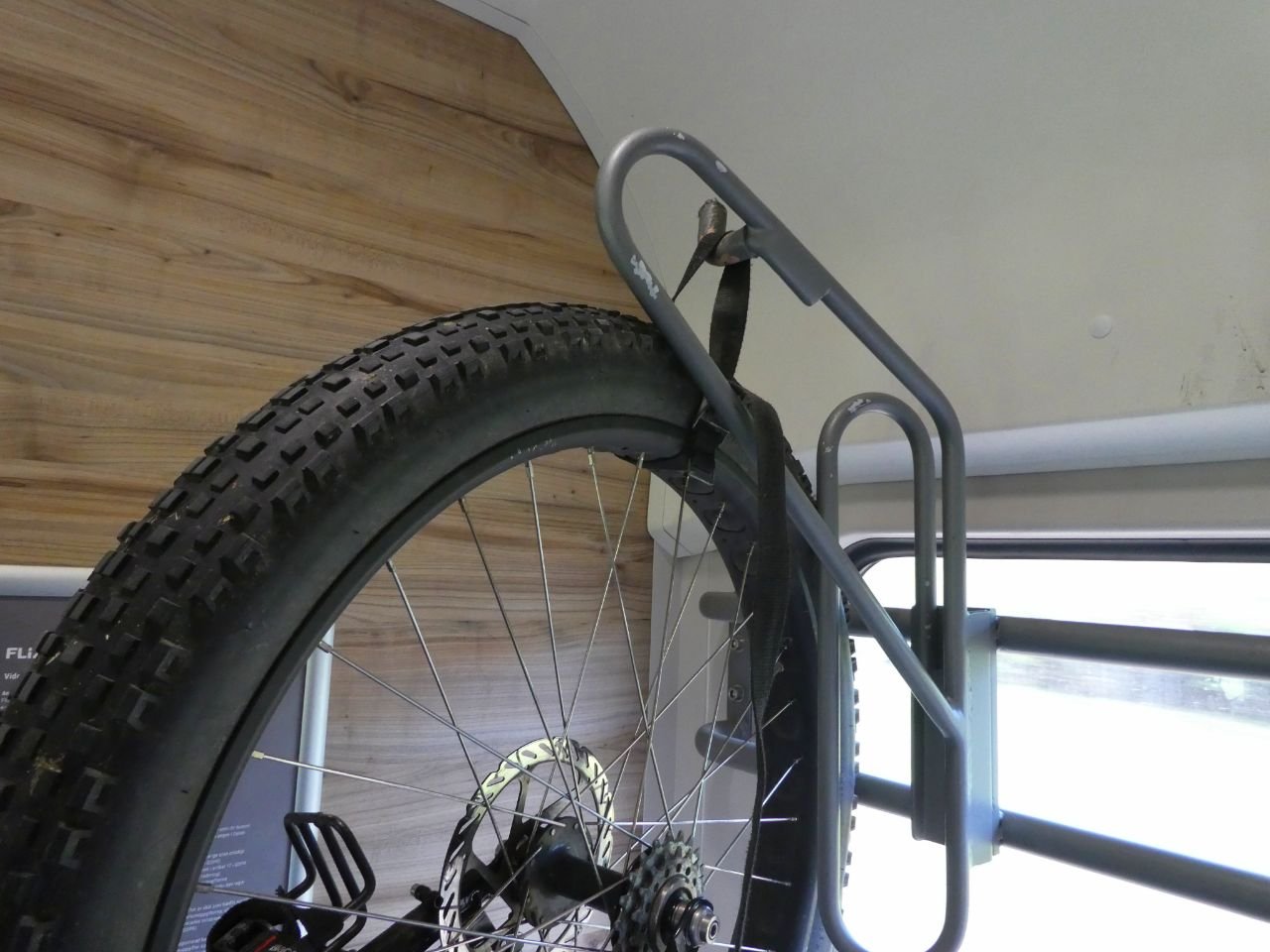 Nog een ontopic plaatje. Zo hang ik de fiets in de trein op, met een spanbandje aan het voorwiel omdat dikke banden nooit in die smalle beugeltjes passen. Achterwiel past ook vaak niet, dus die gaat dan ook met een bandje vast. Kan dus handig zijn om twee kleine spanbandjes mee te nemen.