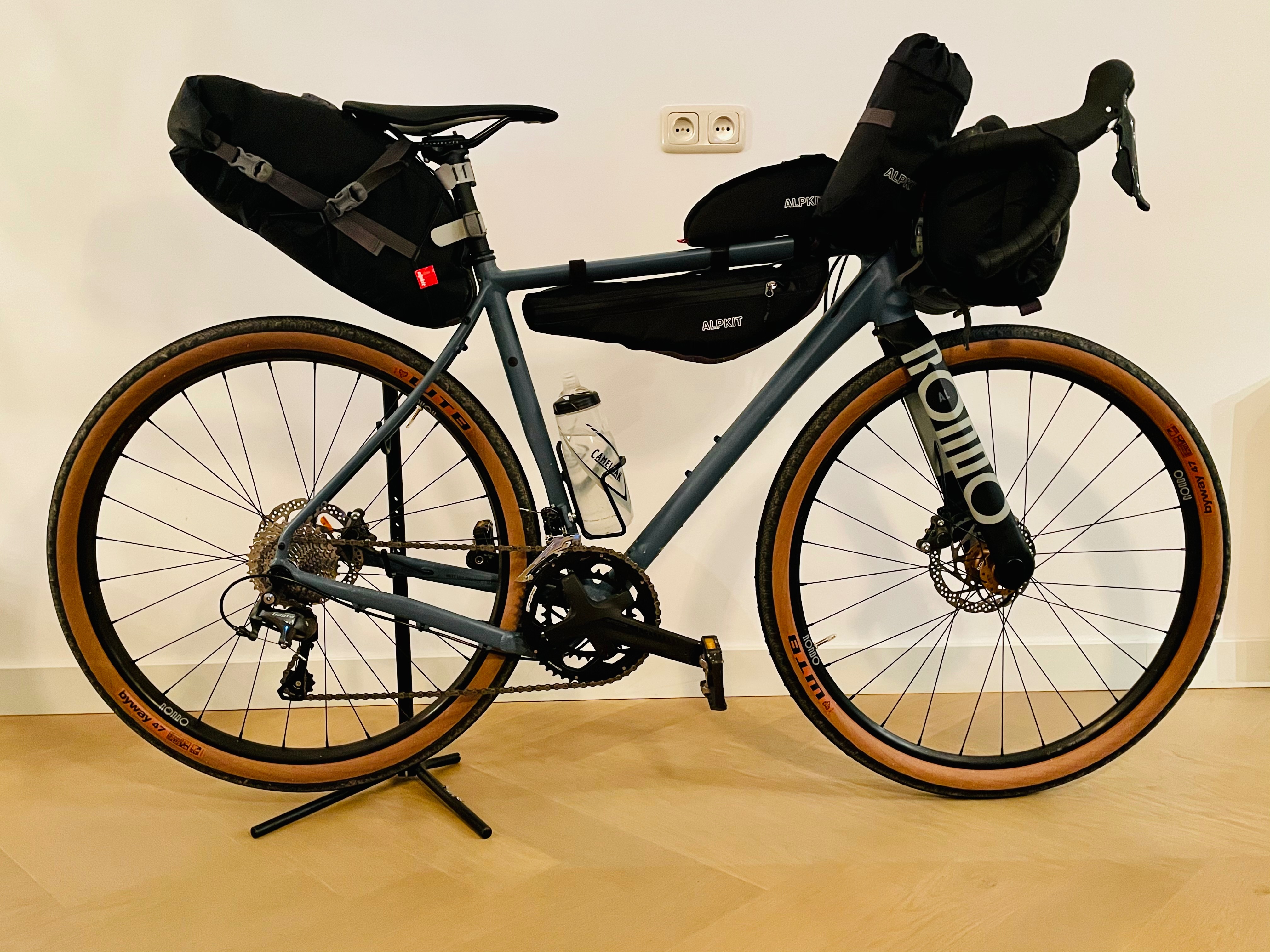 Dus maak het niet te gecompliceerd. Het is eenvoudiger en veel goedkoper om een geschikte fiets te kopen, desnoods een drager los te kopen en vervolgens twee eenvoudige achtertassen en een eenvoudig stuurtasje dan de bikepackingtassen bij elkaar te zoeken voor de toch wel grote hoeveelheid bagage omdat je gaat kamperen.