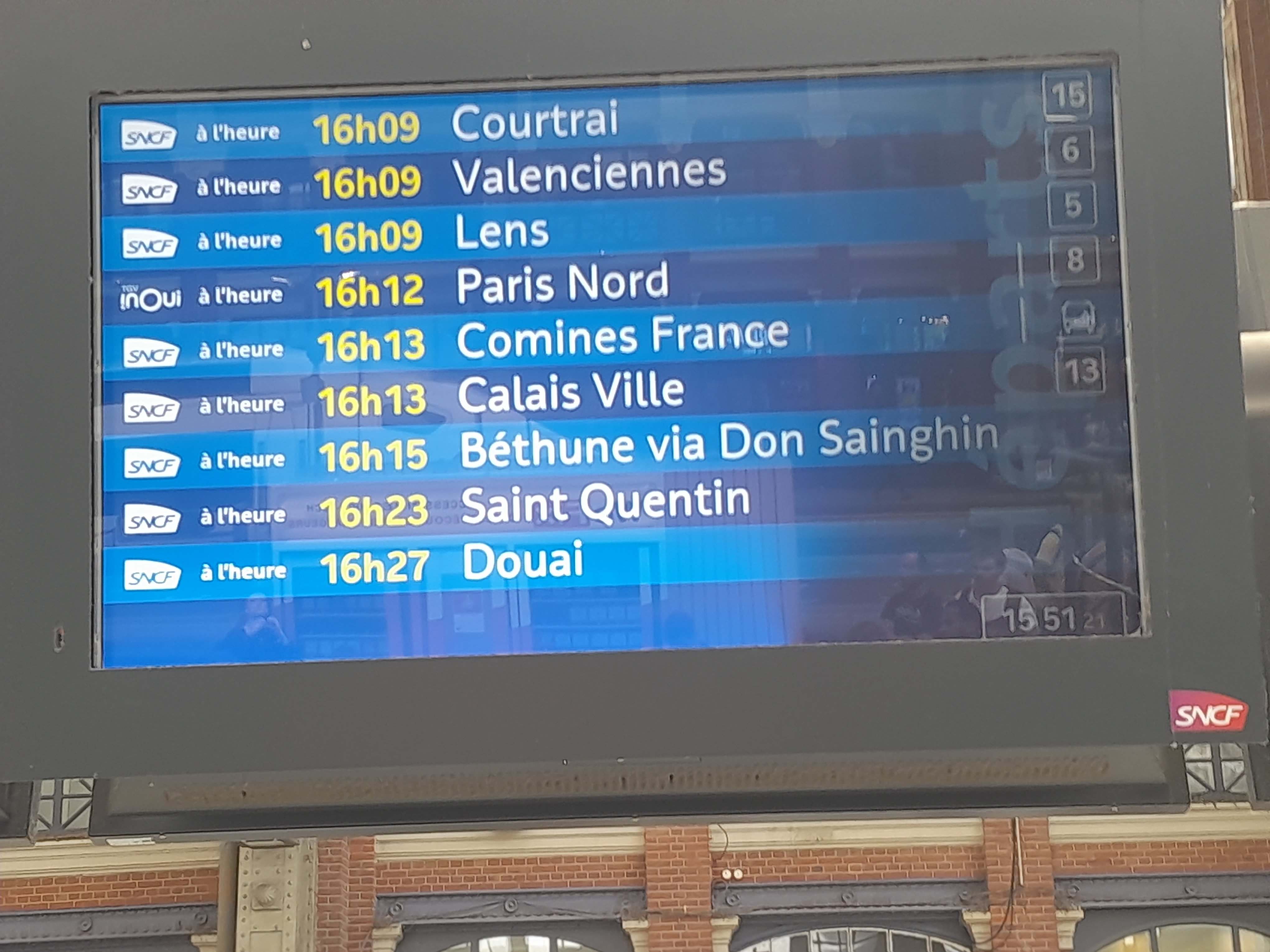 Best een lastig station, want op de vertrekschermen met bestemmingen wordt pas op de laatste 10 minuten aangegeven welke voie (perron) je moet nemen, wat soms tot een gedrang van de vele mensen resulteerde. "Mijn" voie 15 naar Courtrai (Kortrijk) lag buiten naast de overkapping.