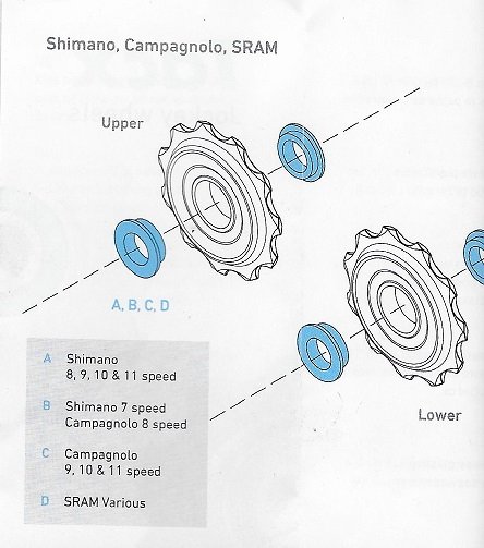 Ik heb bij Rose nieuwe derailleurwieltjes besteld. Daar zitten plastic opvuldopjes (heet dat zo?) bij met letter A, B, C, D. Nu weet ik dat het afhankelijk is van het aantal versnellingen welke opvuldopjes ik moet gebruiken. Er zit echter geen handleiding bij die dat uitlegt en op internet vind ik er niks over. Waarschijnlijk gebruik ik de verkeerde zoekterm... Weet iemand welke letter opvuldopjes ik moet gebruiken bij een 9 speed cassette/derailleur?