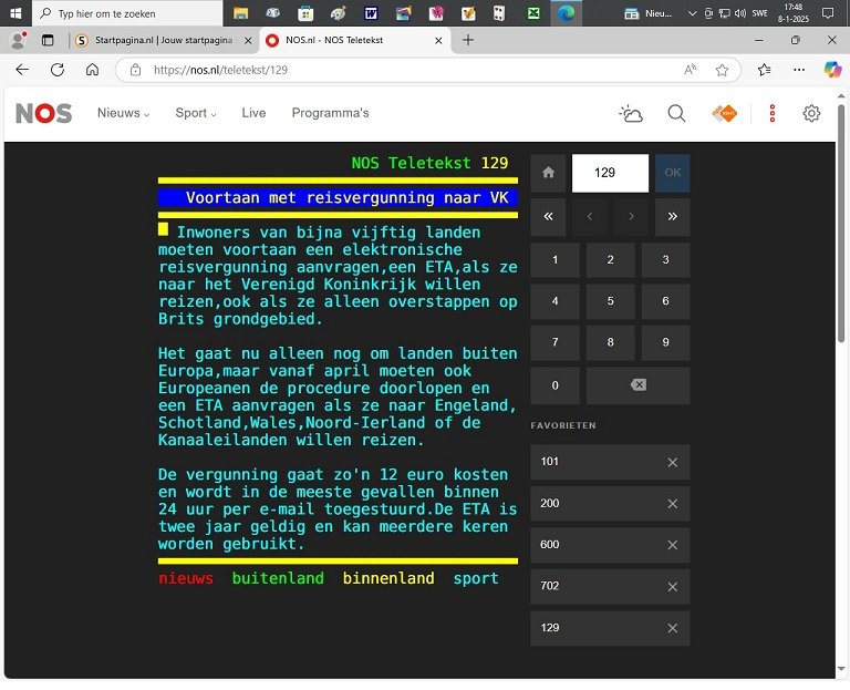 Let op: vanaf 2 april (2024? 2025? staat niet vermeld) moeten alle reizigers, die naar het Verenigd Koninkrijk reizen, een elektronische reisvergunning (ETA) hebben. Die moet van tevoren worden aangevraagd, anders komt u het land niet in.