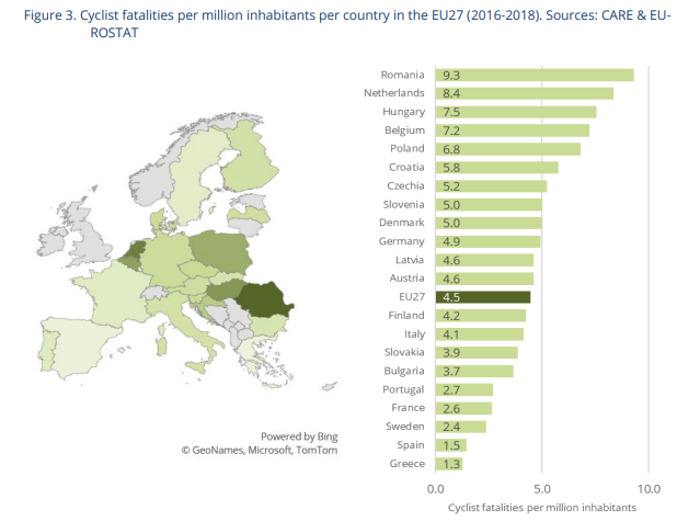 De Europese Road Safety werkgroep brengt elke jaar een rapport uit over dodelijke ongevallen van fietsers waarin je landen kunt vergelijken.