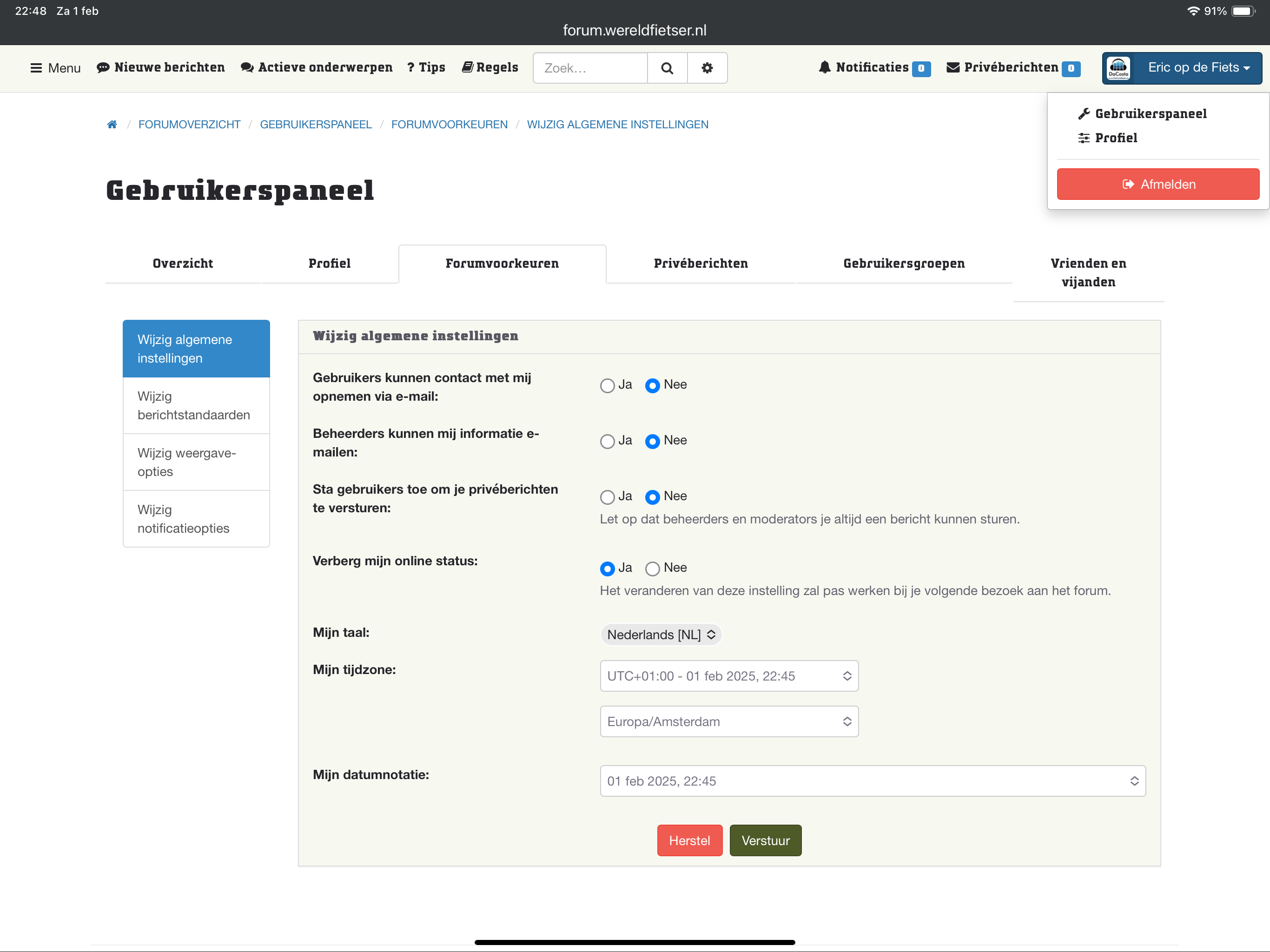 Je kunt dat zelf instellen in je gebruikerspaneel. Daar kom je door rechtsboven op je naam te klikken.math schreef: ↑za 01 feb, 2025 20:44Iemand die het weten kan pm'de me zojuist dat het instelbaar is of de geadresseerde ge-emaild wordt door beheer@wereldfietser.nl
