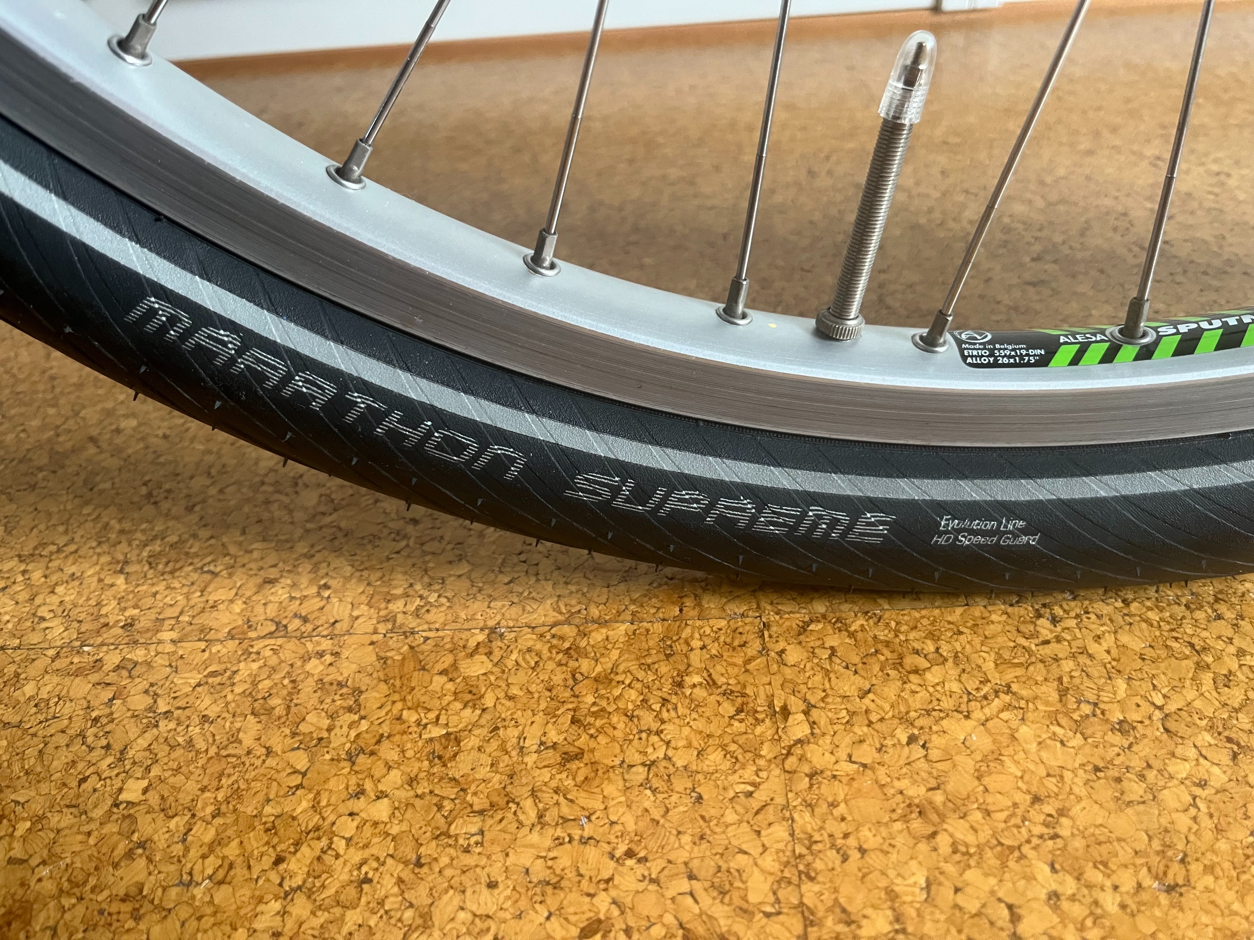 Er ligt een nieuwe band op (Schwalbe Marathon Supreme 50x559 - 26x2.00). Velg is een 26".