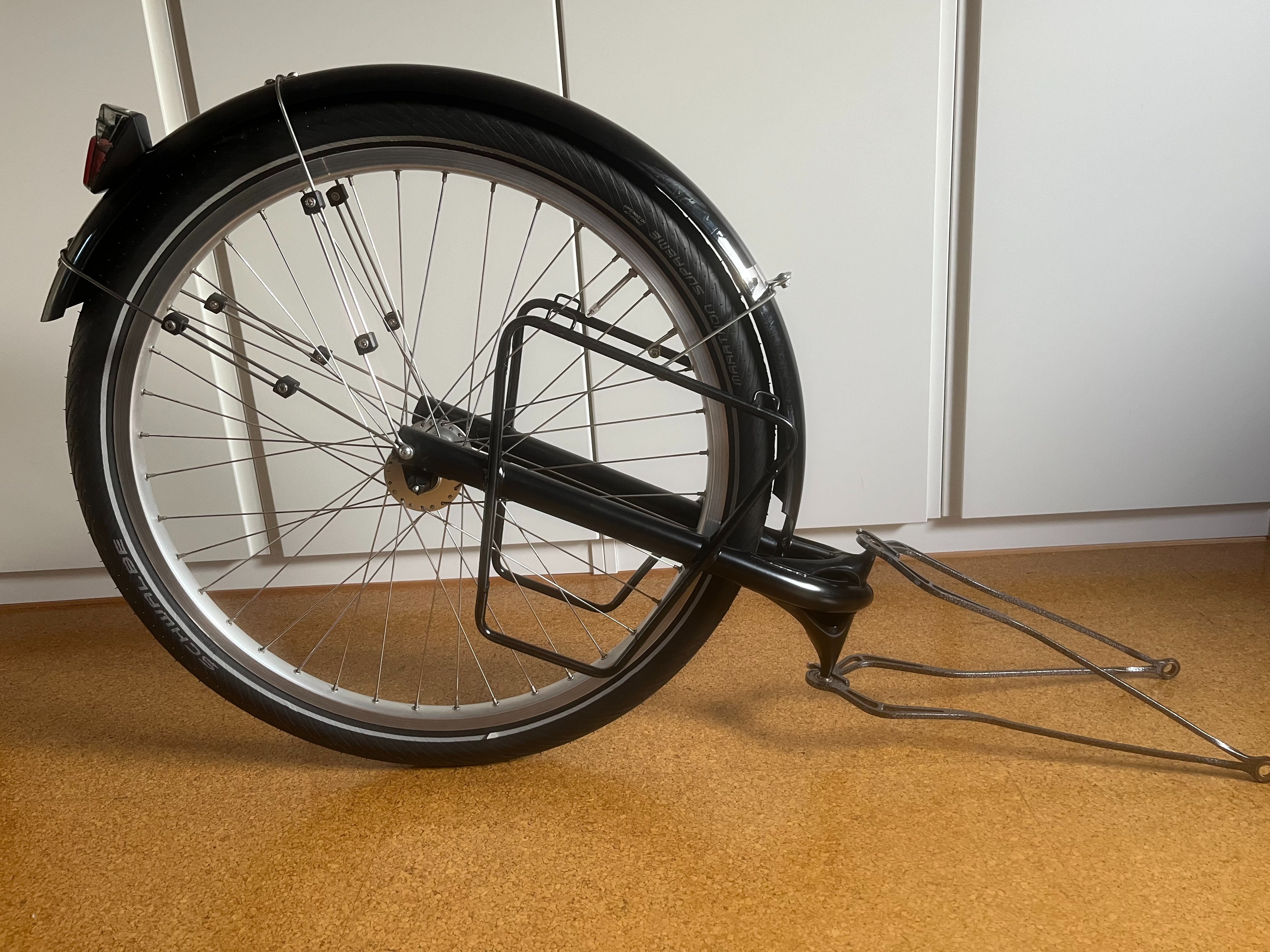 De fietskar is niet nieuw , is gebruikt maar is zeker nog in uitstekende staat, weinig gebruikssporen, nieuwe band, nieuw spatbord en nieuw werkend achterlicht. Geen vlaggetje!