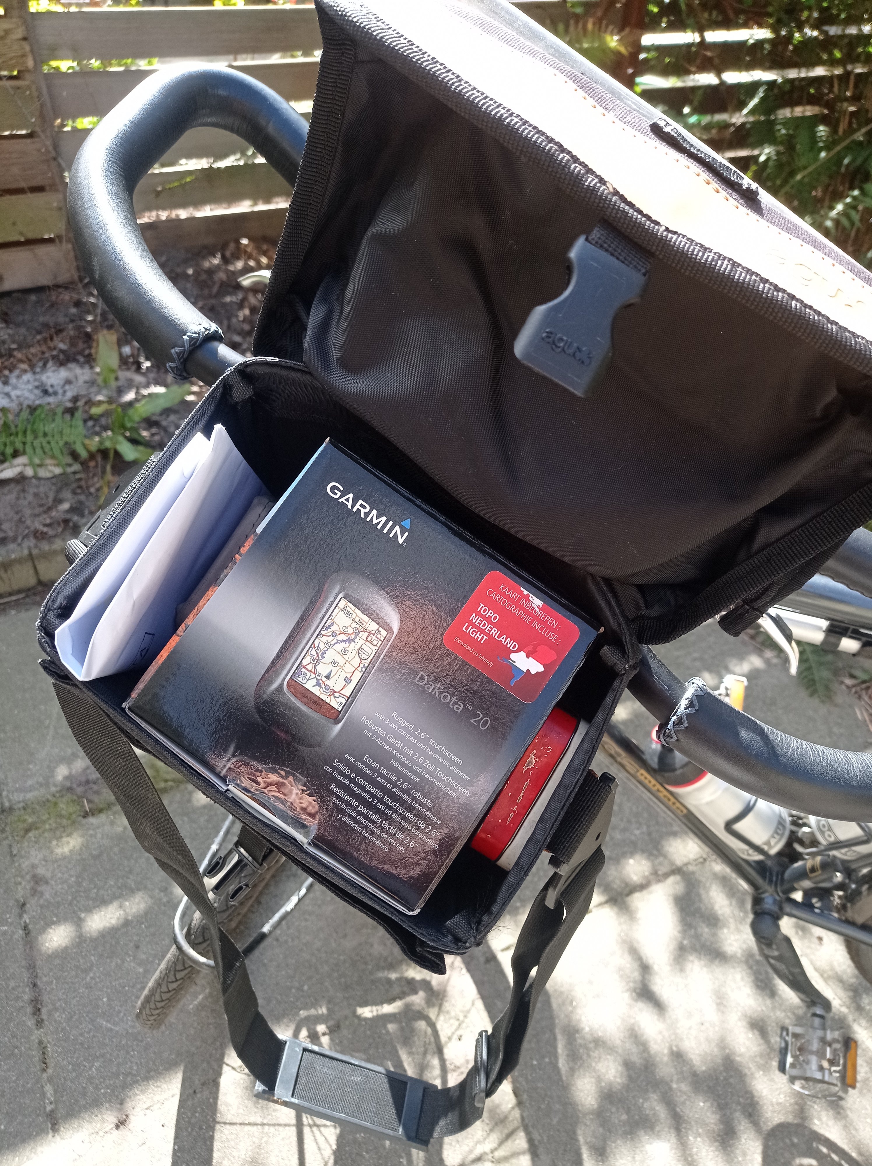 Stuurtas met wat gereedschap en Garmin Dakota.