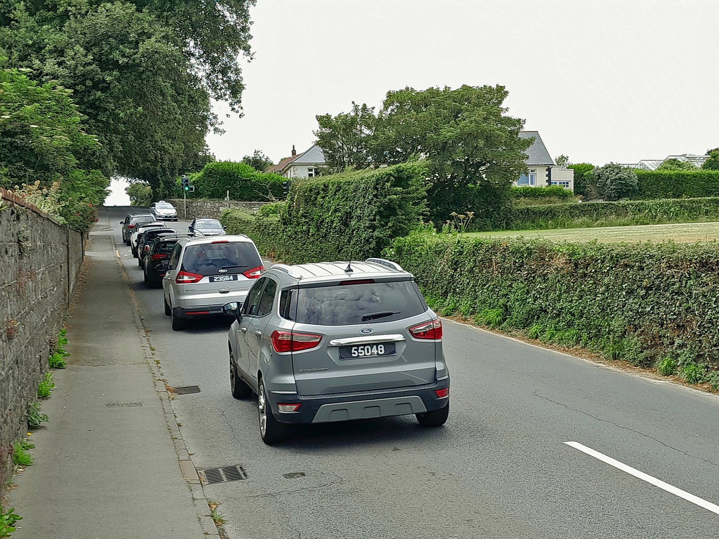 Natuurlijk links verkeer, op zich geen probleem. Let op dat de doorgaande wegen op Guernsey nogal smal zijn. Eén fiets en twee auto’s kunnen niet naast elkaar. Als twee autobussen of vrachtwagens elkaar passeren, kan het wel eens gebeuren dat hun wielen over het trottoir gaan. Het deed me direct denken aan Ierland. Maar iedereen stopte wel netjes achter de fietser, om de tegenligger te laten passeren. Heel hoffelijk. De plattelandsweggetjes zijn nog smaller en niet altijd eenrichtingsverkeer.